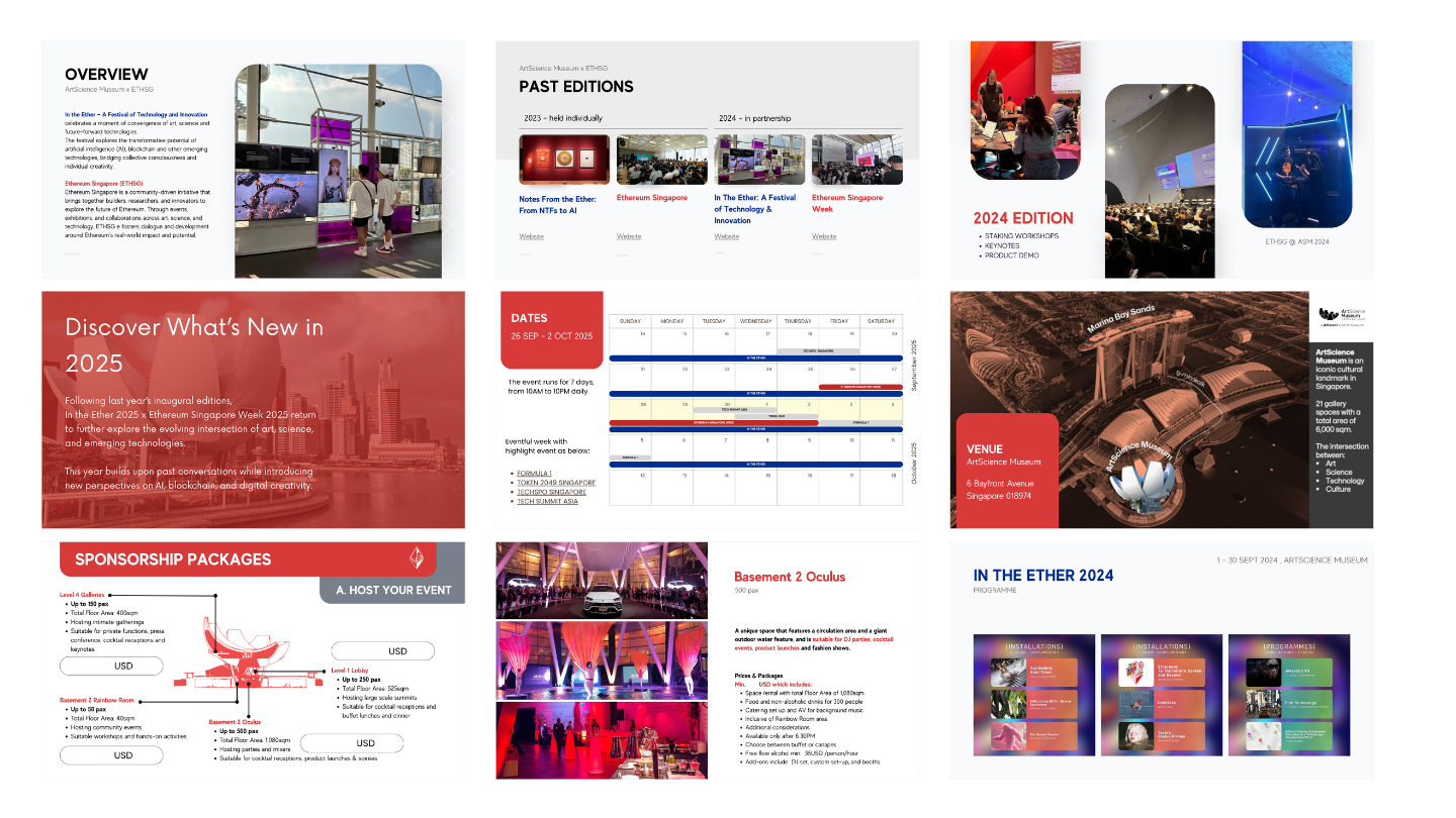 This project involved designing the Sponsorship Deck (Event Prospectus) for a major, international Web3 conference and technology festival. Set at a prestigious art and science venue, the goal was to create a highly professional and visually arresting sales tool that communicated the scale, history, and investment potential of the event to major global sponsors.